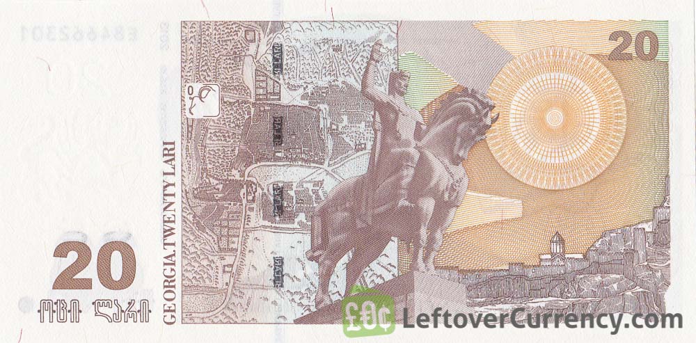 This Georgian 20 Lari banknote features the writer and nationalist Ilia Chavchavadze, and the publications Iveria and Sakartvelos Moambe that he set up. On the reverse of the 20 GEL bill is the monument to the founder of Tbilisi, Vakhtang I Gorgasali.n