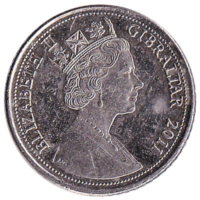 This Gibraltar five pence coin depicts the portrait of Queen Elizabeth II. On the copper-nickel 5p coin, the inscription reads ‘Elizabeth II Gibraltar’.