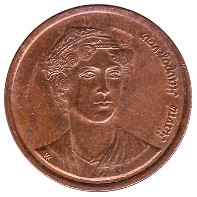 The Bank of Greece issued Greek Drachma coins in 8 different denominations, including this 2 Greek Drachmas coin (Manto Mavrogenous). They are part of the Greek Drachma coins series. The Bank of Greece started issuing these 2 Greek Drachma coins in 1988. They were withdrawn from circulation in 2002.