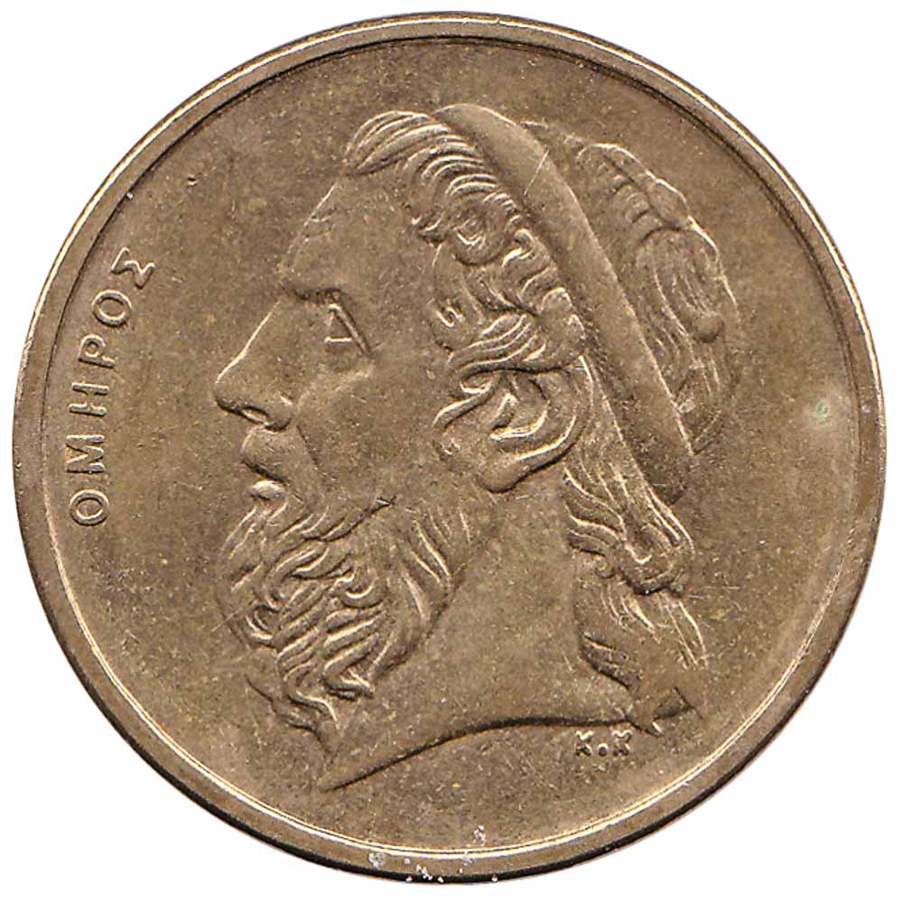 The 50 Drachma coin features an ancient Greek sailing ship on the obverse side, and a portrait of Homer on the reverse side. Homer is the author of the so-callec Homeric Epics, the Iliad and the Odyssey, the two most famous works of ancient Greek literature.