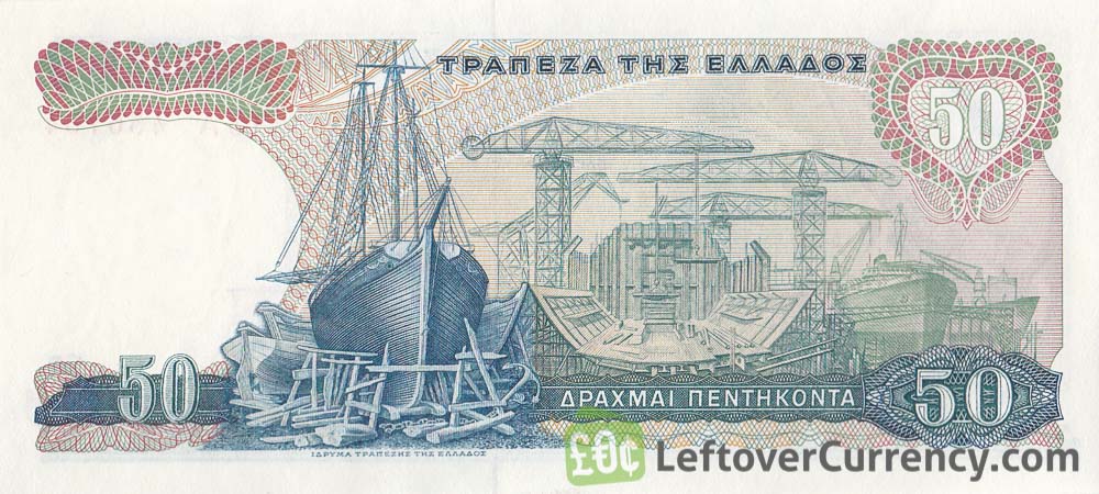 This blue colored note of 50 Greek Drachmai features an ancient galley and ship yards. The female head on the front of the 50 GRD bill is that of Arethuda, daughter of Nereus.