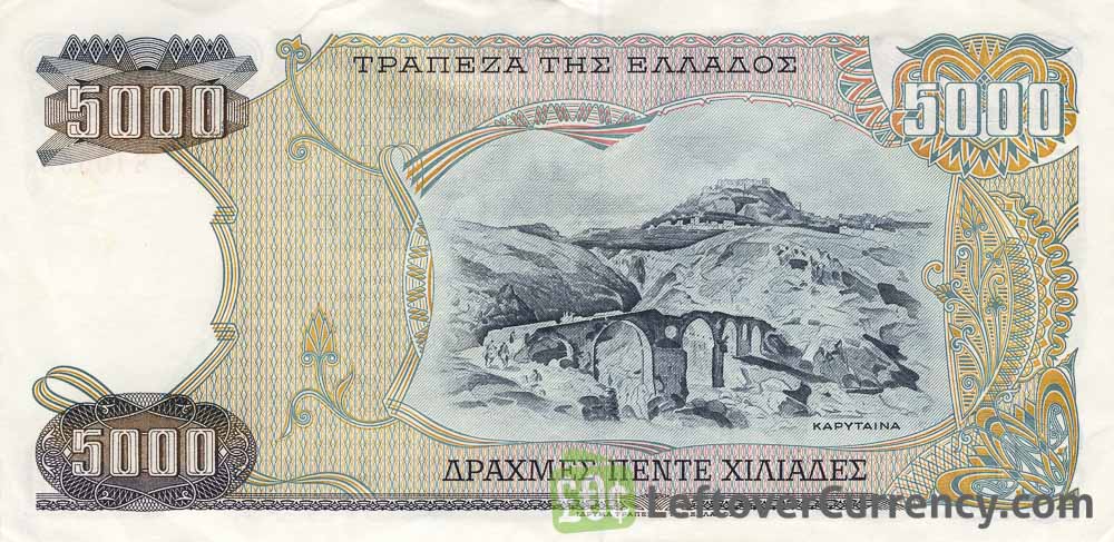 The Bank of Greece issued Greek Drachma banknotes in 10 different denominations, including this 5000 Greek Drachmas banknote (Kolokotronies 1984). They are part of the Greek Drachma banknotes series. The Bank of Greece started issuing these 5000 Greek Drachma banknotes in 1984. They were withdrawn from circulation in 2002.