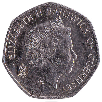 This fifty pence coin features the image of The Duke of Normandy, Elizabeth II. Text on the copper-nickel coin reads ‘Elizabeth II Bailwick of Guernsey’.