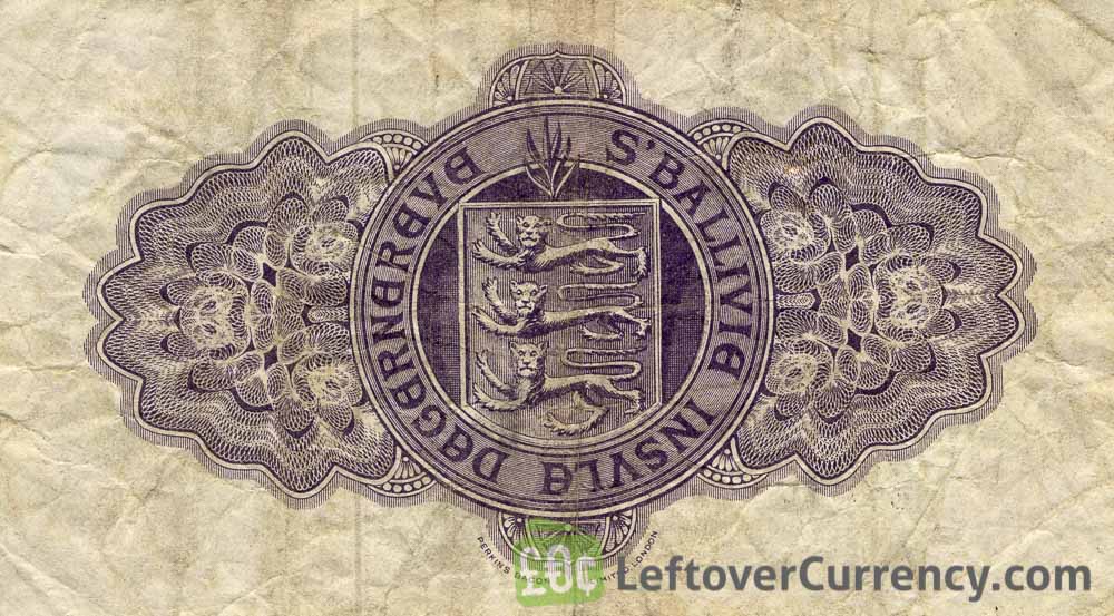 This banknote of 10 Guernsey shillings features a lilac seal. Printed on the note is the text ‘the States of Guernsey’. There are 20 shillings in one pre-decimal Guernsey pound.