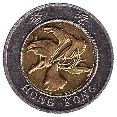 The ten Hong Kong dollars coin weighs 11 grams and has measures 15.6mm across. The Bauhinia flower is featured on the back side of the bi-metallic $10 HKD piece.