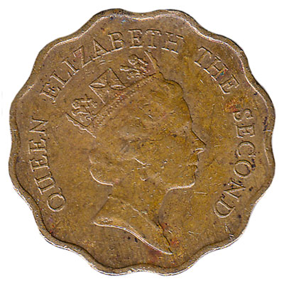 This twenty cents coin from Hong Kong features a portrait of Queen Elizabeth II. The brass-nickel 20c piece from Hong Kong has a mass of 2.59 grams and a diameter of 18.01mm.