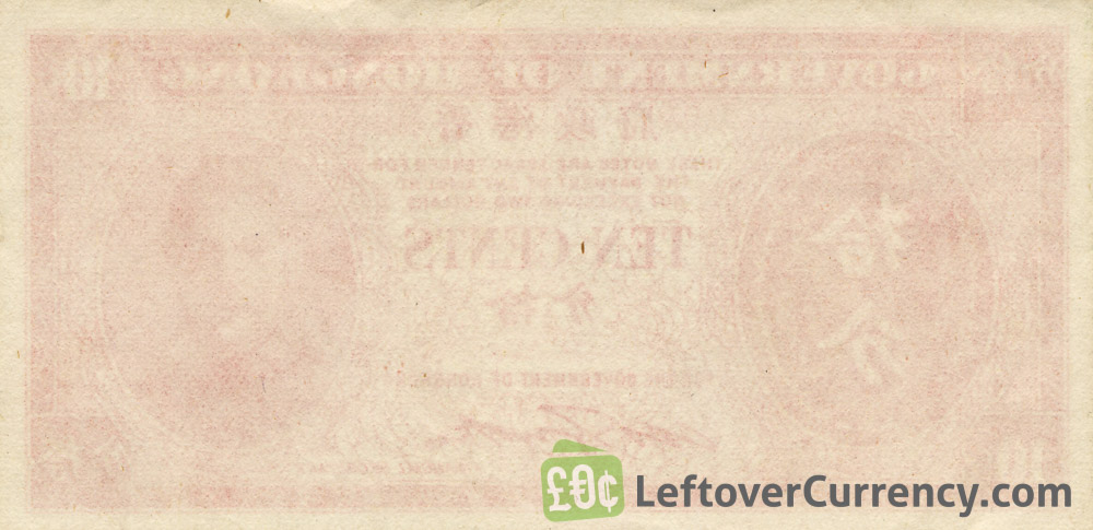The Government of Hong Kong issued Hong Kong Dollar banknotes in 6 different denominations, including this Government of Hong Kong 10 cents banknote (King George VI). They are part of the withdrawn Government of Hong Kong Dollar banknotes series. The Government of Hong Kong started issuing these 0.1 Hong Kong Dollar banknotes in 1945. They were withdrawn from circulation in 1961.
