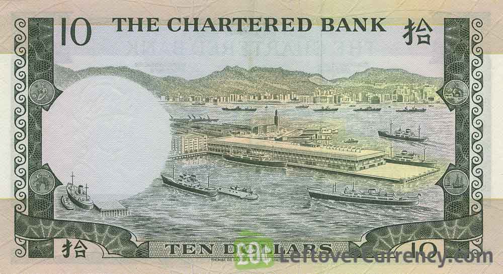 The banknote of ten dollars shows the Ocean Shipping Terminal in Hong Kong harbour. The words ‘The Chartered Bank’ are printed on the $10 HKD banknote.
