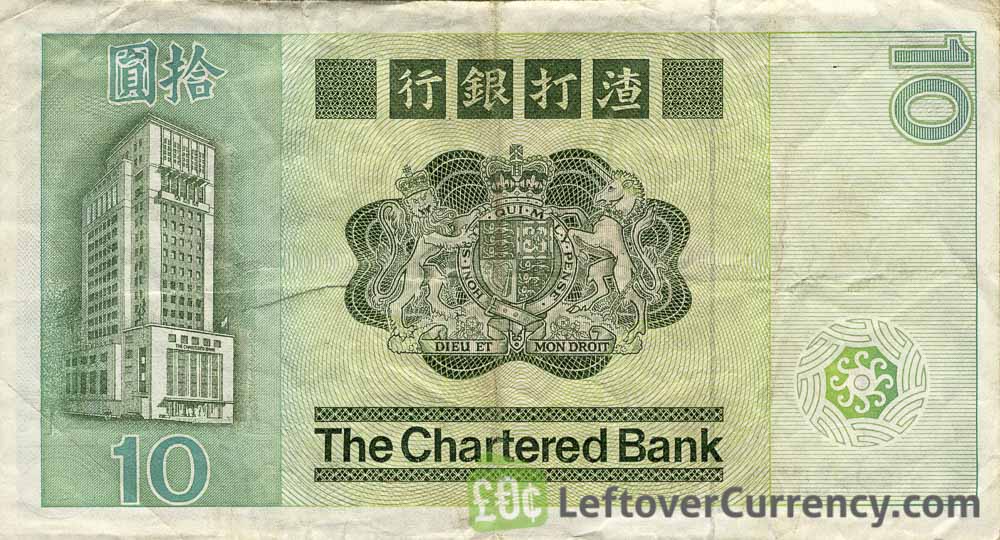 The Standard Chartered Bank issued Hong Kong Dollar banknotes in 8 different denominations, including this 10 Hong Kong Dollars banknote (Chartered Bank 1980 issue). They are part of the withdrawn Standard Chartered Bank Hong Kong Dollar banknotes series. The Standard Chartered Bank started issuing these 10 Hong Kong Dollar banknotes in 1980. They were withdrawn from circulation in 1994.