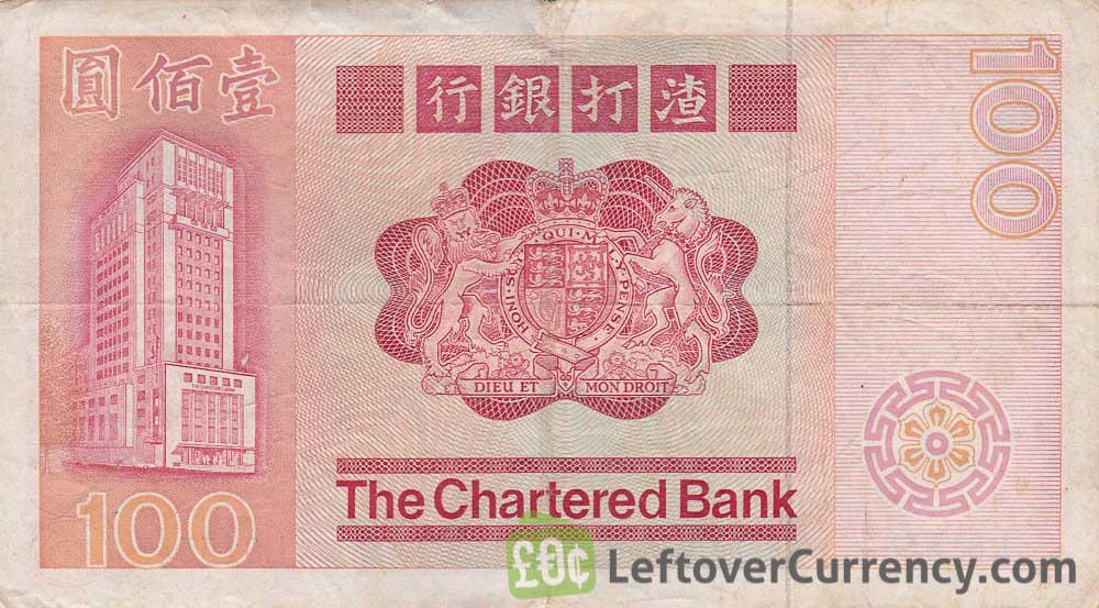 This one hundred Hong Kong dollars banknote measures 153mm by 77mm. On the paper banknote a caption reads ‘The Chartered Bank’. The main colors are red and orange. The front of the $100 HKD banknote features the mythological horse ‘Qilin’. The bank building and the bank’s arms are on the backside.
