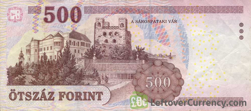 The banknote of otszaz forint depicts Ferenc Rakoczi II, Hungarian nobleman. The words ‘Magyar Nemzeti Bank’ are printed on the paper note. On the back of the note is Sárospatak Castle.