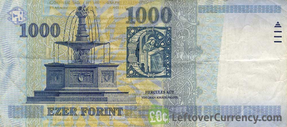 The note of ezer forint depicts King Matyas of Hungary. Text on the paper bill reads ‘Magyar Nemzeti Bank’. The backside of the one thousand forint note shows a fountain in the Palace of Visegrád.