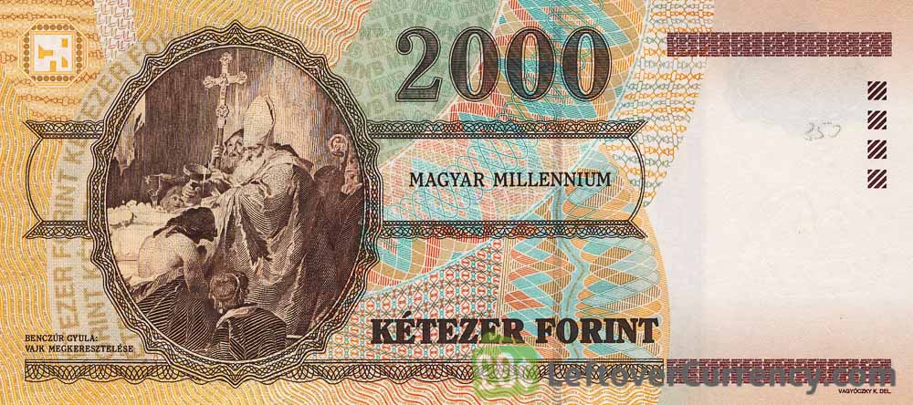The Hungarian National Bank issued Hungarian Forint banknotes in 7 different denominations, including this 2000 Hungarian Forints banknote (Millennium Crown of St. Stephan). They are part of the withdrawn Hungarian Forint banknotes series. The Hungarian National Bank started issuing these 2000 Hungarian Forint banknotes in 2000. They were withdrawn from circulation in 2007.
