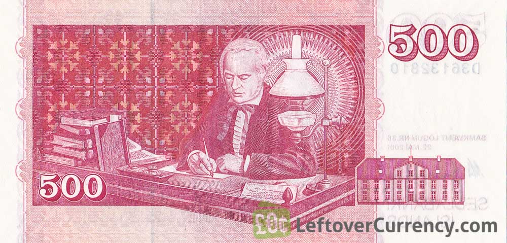 The banknote of 500 Icelandic Kronur contains the date 22 May 2001. On the obverse side of the Fimm Hundrud Kronur bill is the portrait of the leader of Iceland’s independent movement, Jon Sigurosson. The revolutionary leader is pictured on the back side, seated at his desk writing.