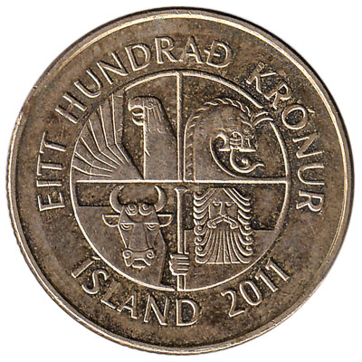 The Central Bank of Iceland issued Icelandic Króna coins in 9 different denominations, including this 100 Icelandic Kronur coin. They are part of the Icelandic Kronur coins series. The Central Bank of Iceland started issuing these 100 Icelandic Króna coins in 1995. They are currently still in circulation.