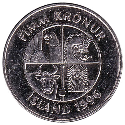 The Central Bank of Iceland issued Icelandic Króna coins in 9 different denominations, including this 5 Icelandic Kronur coin. They are part of the Icelandic Kronur coins series. The Central Bank of Iceland started issuing these 5 Icelandic Króna coins in 1981. They are currently still in circulation.