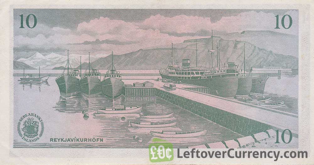 The multicolour banknote of 10 Icelandic Kronur features Jón Eriksson, administrator and promotor of the enlightenment in Iceland. The back side of the ten kronur note has a view on Reykjavik harbour.