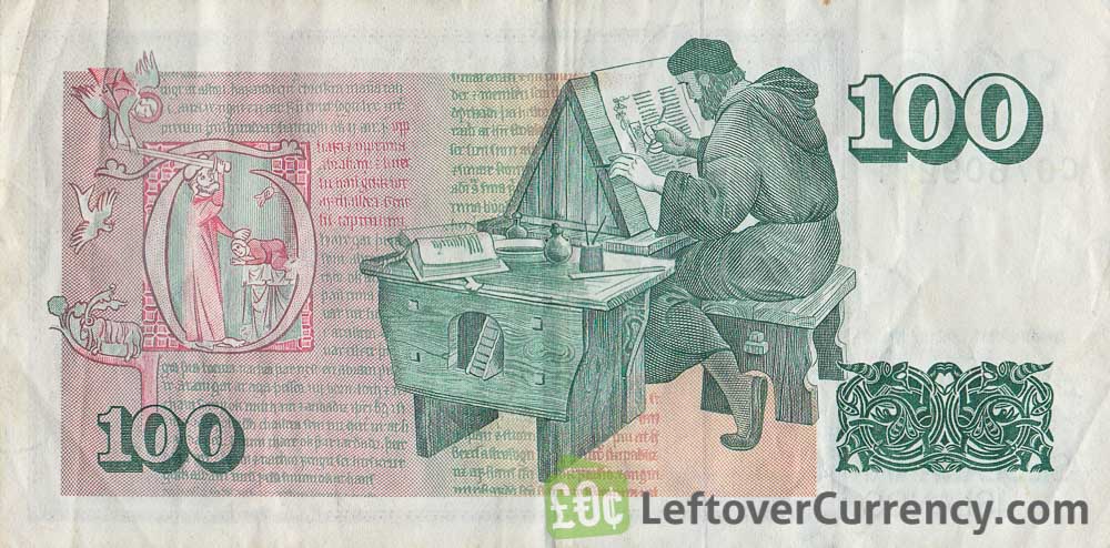 The banknote of 100 Icelandic Krónur features Icelandic scholar Arni Magnússon with a manuscript. On the back side of the Fimm Hundrud Kronur bill is a monk at work.