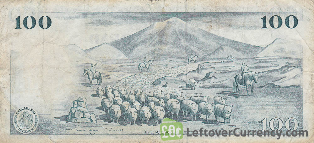 The old 100 Icelandic Krónur banknote is coloured green and pink. The portrait on the front side is that of Icelandic entrepreneur Tryggvi Gunnarsson. On the back side is a flock of sheep with riders on horses. The mountain in the background is Mt. Hekla, an active stratovolcano.