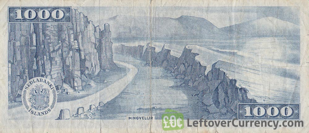 The old banknote of 1000 Icelandic Krónur features Jón Sigurthsson, leader of the Icelandic independence movement. On the back side of the 1000 ISK note, dated 1961, is a mountain road and rock formations.