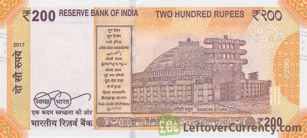 Repeat these steps for any other notes and coins you want to exchange. Complete checkout and get paid within 5 days of receiving your currencies. To exchange your 200 Indian Rupees banknote (Gandhi Sanchi Stupa) for cash: add it to your wallet now!