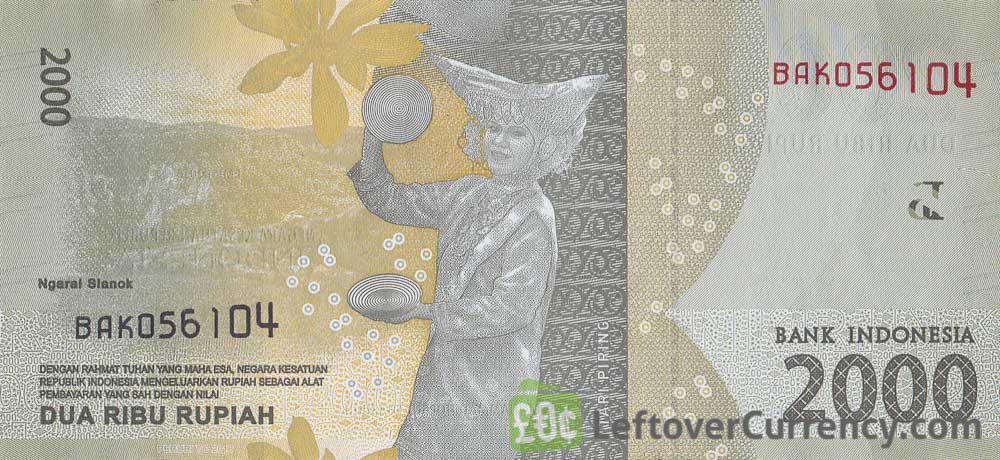 On the front of the Rp 2000 Indonesian Rupiah banknote is a portrait of National Hero Mohammad Hoesni Thamrin. The back side shows a view on Ngara Sianok Canyon in Sumatra, and a traditional Indonesian Tari Piring plate dancer.