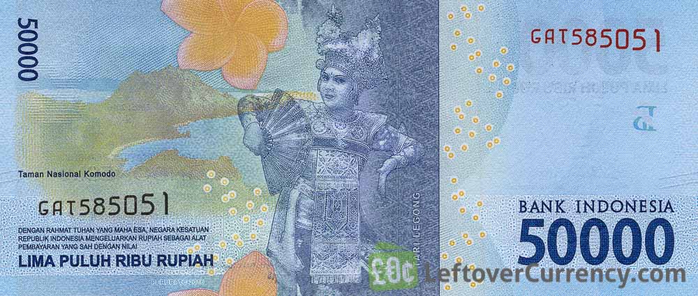 This banknote of 50,000 Indonesian Rupiah has a portrait of Ir. Djuanda Kartawidjaja, National Hero, on the front side. On the Rs 50000 IDR bill’s back side is a Tari Legong dancer with handheld fan and an aerial view on Komodo National Park.