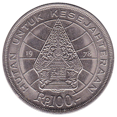 This commemorative Rp100 coin, dated 1978, was issued to promote the Forestry for Prosperity program by the Indonesian government. The 100 rupiah piece features the Batang Garing (tree of life) and a traditional house of the Minangkabau in West Sumatra.