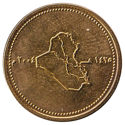 The gold-coloured 50 Iraqi dinars coin is made of brass plated steel. Like all current Iraqi coins it features a map outline of Iraq with the rivers Tigris and Euphrates. All text on the 50 IQD piece is in Arabic and translatest to “Iraq Central Bank” and “50 dinars”. The coin is dated 1425 AH (2004 AD).