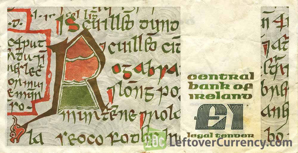 The Central Bank of Ireland issued Irish Pound banknotes in 8 different denominations, including this 1 Irish Pound banknote (Queen Medb). They are part of the Irish Pound banknotes series. The Central Bank of Ireland started issuing these 1 Irish Pound banknotes in 1977. They were withdrawn from circulation in 2002.