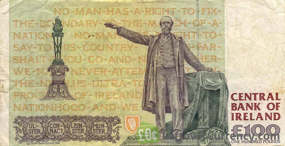 The Central Bank of Ireland issued Irish Pound banknotes in 8 different denominations, including this 100 Irish Pounds banknote (Charles Stewart Parnell). They are part of the Irish Pound banknotes series. The Central Bank of Ireland started issuing these 100 Irish Pound banknotes in 1996. They were withdrawn from circulation in 2002.