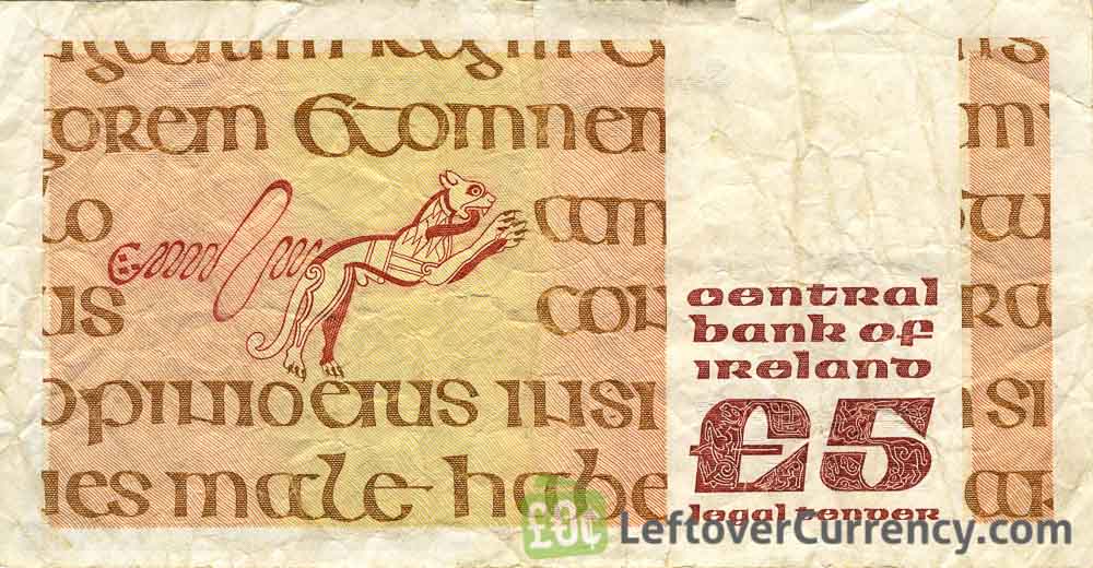 - Text: 5, Banc Ceannais na h Eireann, Central Bank of Ireland, Five Pounds, Legal Tenuen