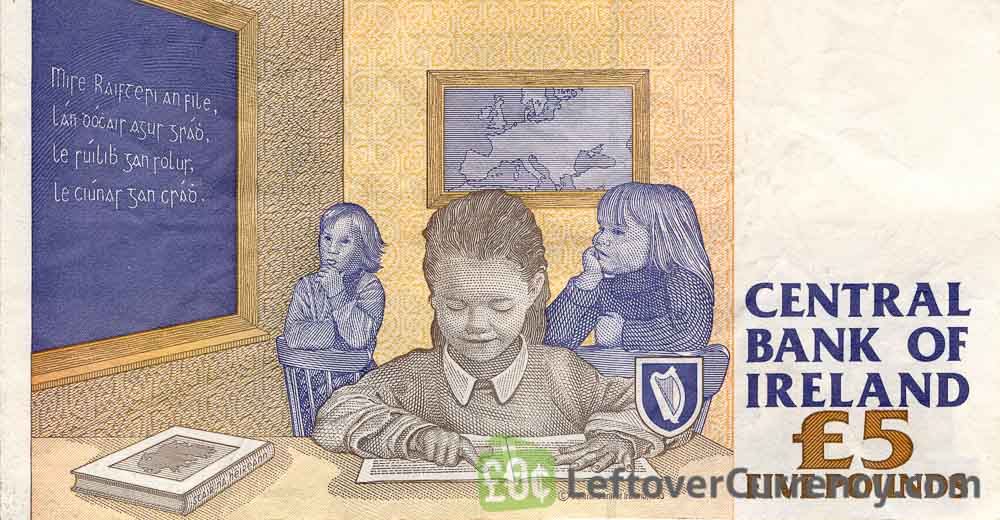 The bill of five pounds depicts Sister Catherine McAuley, standing in front of the Mater Misericordiae Hospital. Printed on the paper note is the text ‘Banc Ceannais na hÉireann’. The backside of the £5 pound bill features three school children in a classroom.