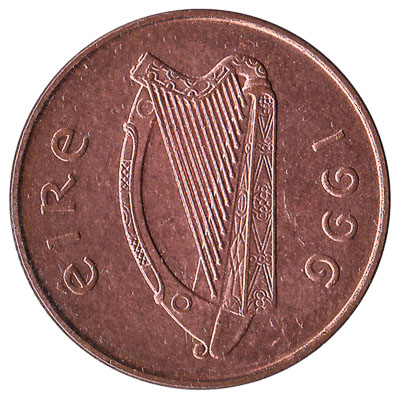 The Irish coin of 2p features an Irish harp and the word ‘Eire’. There are 100 pence in one Irish pound. 2 pence is the equivalent of 0.02 Irish Pounds.