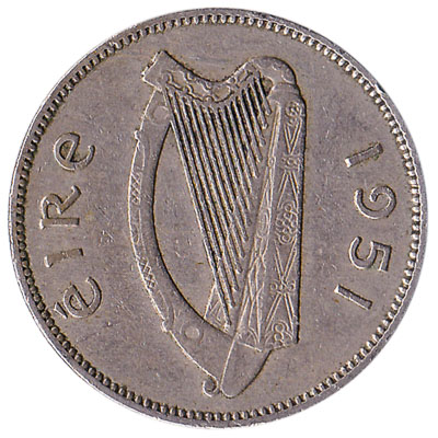 The Central Bank of Ireland issued Irish Pound coins in 14 different denominations, including this Irish predecimal shilling coin. They are part of the Irish Pound coins series. The Central Bank of Ireland started issuing these 0.05 Irish Pound coins in 1928. They were withdrawn from circulation in 1967.