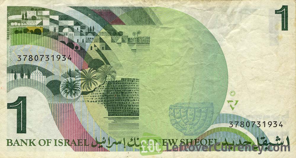 This one new sheqel banknote depicts Rabbi Moses Maimonides, Israeli philosopher. Text on the green 1 shekel currency note reads ‘Bank of Israel’. It has the same design as the 1000 old Sheqalim banknote, which was replaced by this 1 shekel note in 1986.