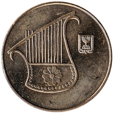 The 1/2 Shekel coin from Israel weighs 6.5 grams and measures 26mm across. The aluminium-bronze half shekel piece has a lyre, a kind of harp, on the back side.