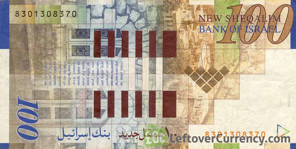 - Text: 100, Bank of Israel, One Hundred New Sheqalim