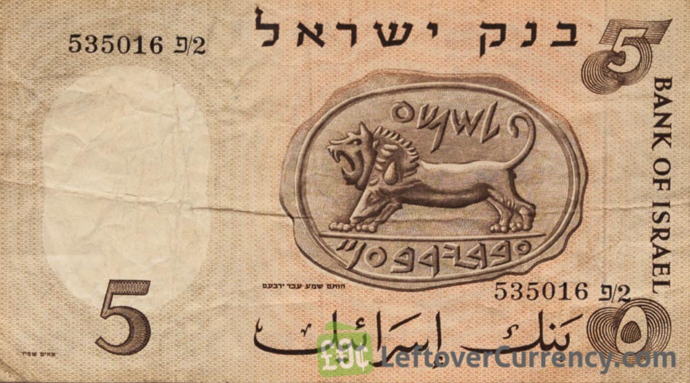 On the banknote of I£5 Israeli Pounds is the image of a workman in front of an industrial site. The back side of the 1958-dated 5 Lirot bill from the Bank of Israel shows the Seal of Shema that was found in the biblical city of Meggido in 1903.