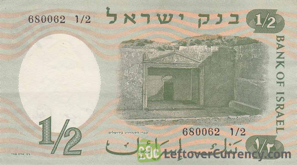 The Bank of Israel issued Israeli Pound banknotes in 8 different denominations, including this 1/2 Israeli Lira banknote (Tombs of the Sanhedrin). They are part of the obsolete Israeli Pound banknotes series. The Bank of Israel started issuing these 0.5 Israeli Pound banknotes in 1958. They were withdrawn from circulation in 1968.