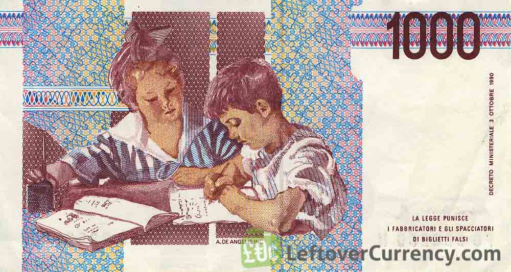 The Banca d'Italia issued Italian Lira banknotes in 10 different denominations, including this 1000 Italian Lire banknote (Maria Montessori). They are part of the Italian Lira banknotes series. The Banca d'Italia started issuing these 1000 Italian Lira banknotes in 1990. They were withdrawn from circulation in 2002.