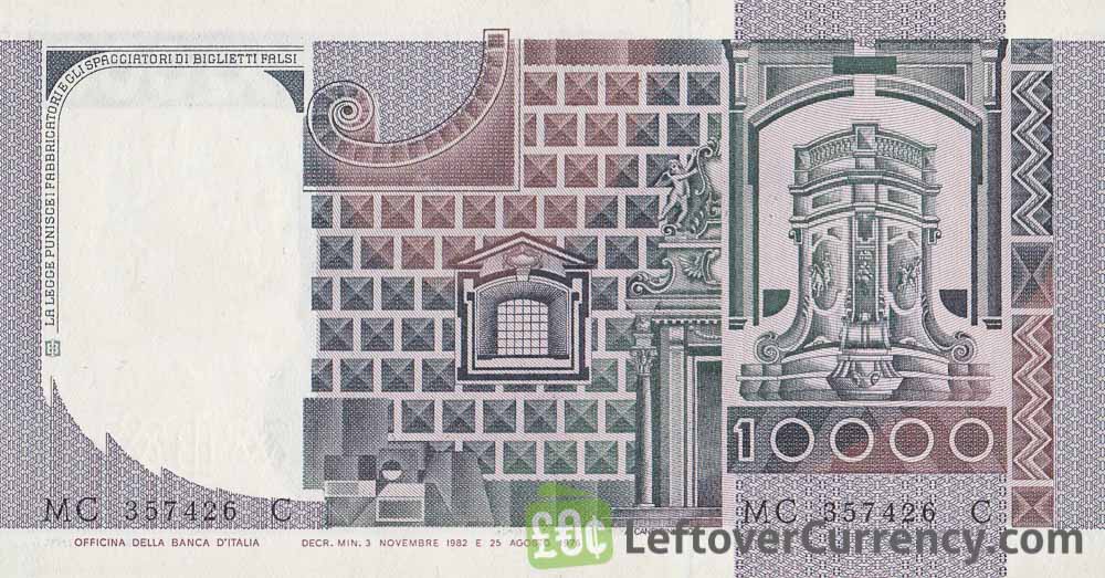 The design of the grey-green coloured note of 10,000 Italian Lire features architectural elements and a portrait of a man by Italian painter Andrea del Castagno. The back side contains elements of the Chiesa del Gesù Nuovo church in Naples.
