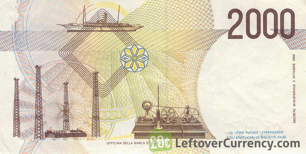 The Banca d'Italia issued Italian Lira banknotes in 10 different denominations, including this 2000 Italian Lire banknote (Guglielmo Marconi). They are part of the Italian Lira banknotes series. The Banca d'Italia started issuing these 2000 Italian Lira banknotes in 1990. They were withdrawn from circulation in 2002.