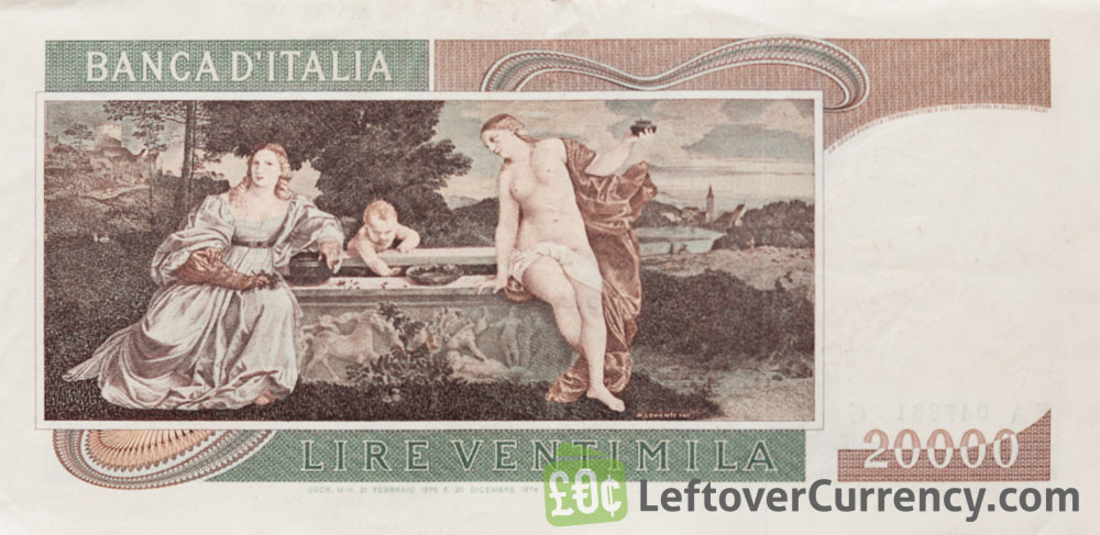 The Banca d'Italia issued Italian Lira banknotes in 10 different denominations, including this 20000 Italian Lire banknote (Titian). They are part of the Italian Lira banknotes series. The Banca d'Italia started issuing these 20000 Italian Lira banknotes in 1975. They were withdrawn from circulation in 1983.