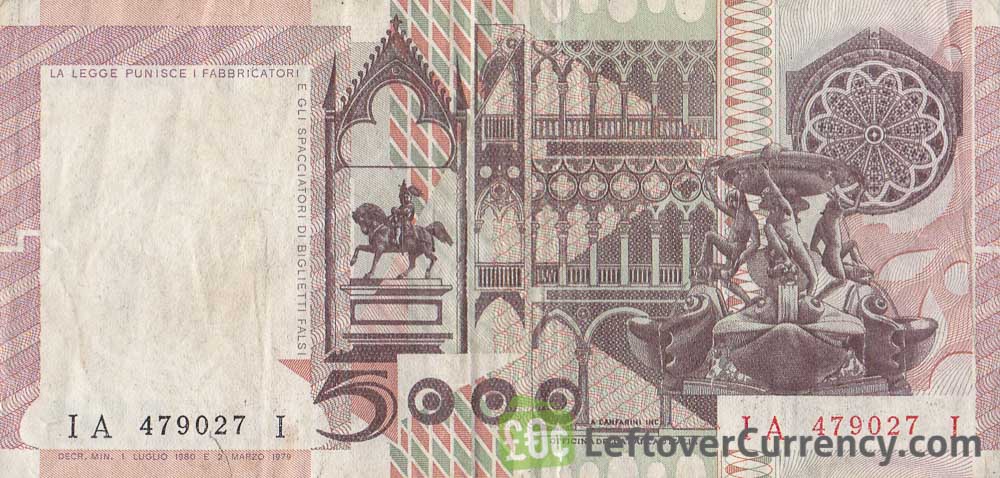 The banknote of 5000 Italian Lire has a portrait of Sicilian Renaissance painter Antonello da Messina. The back side of the Lire Cinquemila bill features architectural elements, including a statue of Marcus Aurelius on a horse, and the Fountain of the Tortoises in Rome.