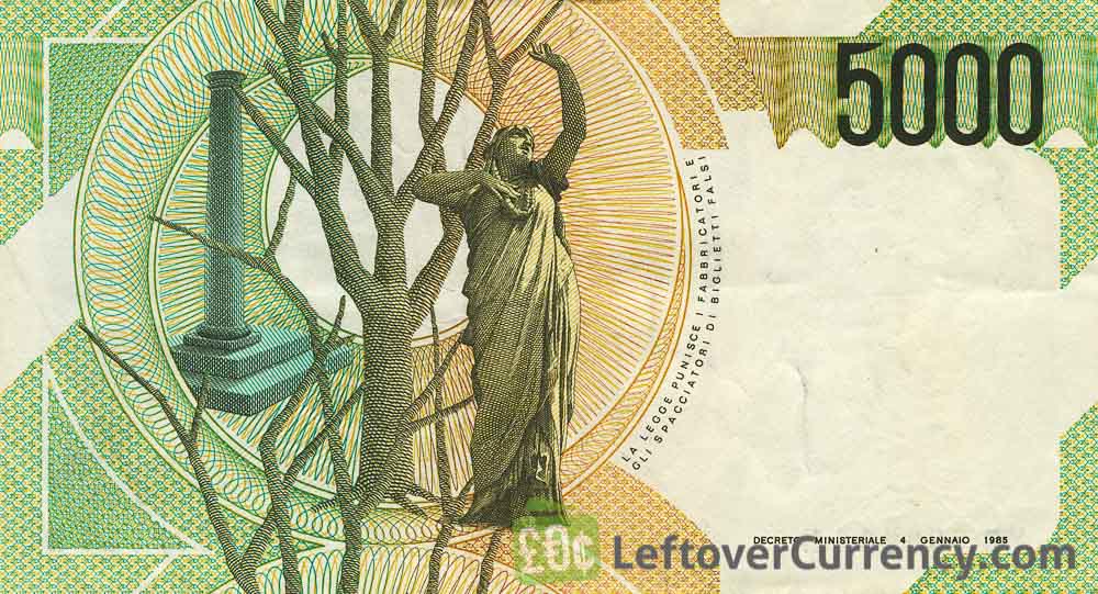 The Banca d'Italia issued Italian Lira banknotes in 10 different denominations, including this 5000 Italian Lire banknote (Vincenzo Bellini). They are part of the Italian Lira banknotes series. The Banca d'Italia started issuing these 5000 Italian Lira banknotes in 1985. They were withdrawn from circulation in 2002.