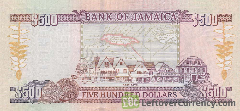 - Text: 500, Bank of Jamaica, Five Hundred Dollars, Nanny of the Maroons, Out of many, one people, Port Royal