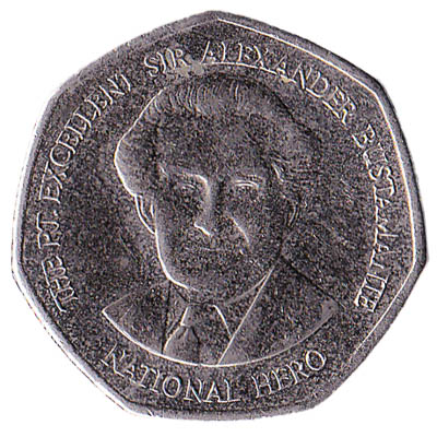 The one dollar coin from Jamaica weighs 2.9 grams and measures 18.5mm across. On the front side is the Jamaican national coat of arms. The back side of the $1 coin shows the portrait of national hero Marcus Garvey, Jamaica’s first Prime Minister.