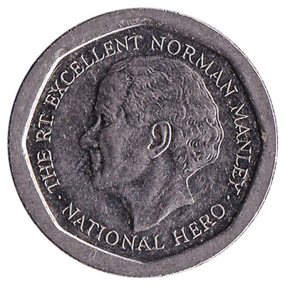 The Jamaican national hero, lawyer and statesman Norman Manley, is pictured on the $5 dollar coin from Jamaica. The stainless steel five dollars piece weighs 4.2 grams and measures 21.5mm in diameter.
