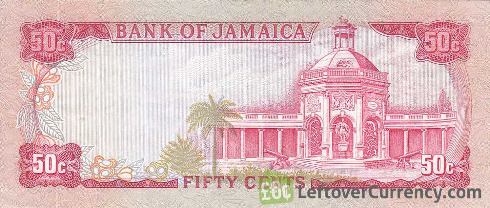 This banknote of fifty cents from Jamaica is the equivalent of half a dollar. It used to be the lowest value banknote in Jamaica until it was replaced by a coin in 1976. The portrait on the red coloured 50c bill is that of Jamaican black nationalism leader Marcus Garvey. On the back side of the $0.50 JMD banknote is Rodney’s Memorial in Spanish Town, Jamaica.